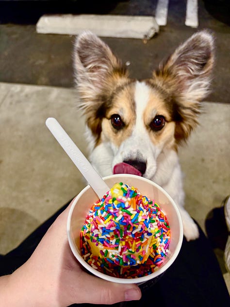 A weekday afternoon walk to get coffee with Adam and Olive | Sitting down to work, late morning, face freshly moisturized | Family walk to get ice cream for dinner at sunset with cotton candy skies and a warm breeze | Unexpected glimpses of the morning ocean in Santa Monica | Impromptu dog crew playdates with wine and snacks well into the evening | Picking up poké bowls for dinner and racing home for Jeopardy | A workshop with Poets & Writers, mapping the path forward