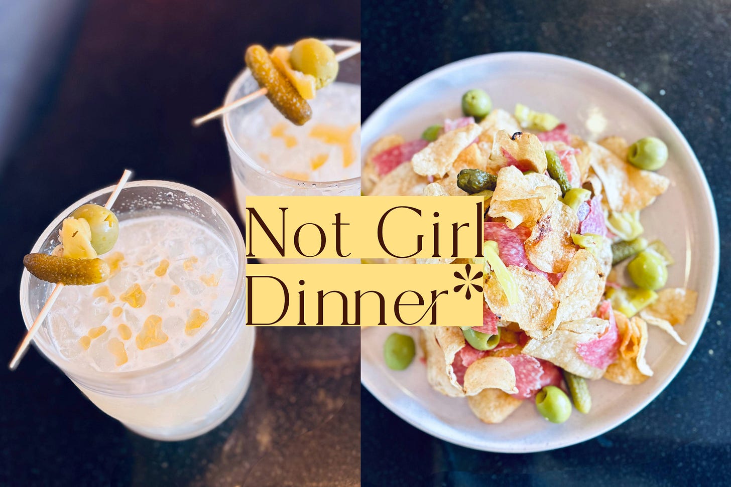 A few jars of pickly briny things that are not your standard pickle (per Effie’s preferences), a bag of kettle chips, and some super thinly sliced salami is really enough to keep us happy. On this particular night, I filled it out with a simple easy snap pea salad and a focaccia pizza using this dough as the base, topped with sungold sauce, fontina, and some salt and pepper pork sausage from the farmer’s market. Basil being the common thread that tied the two together. But frankly, today’s daydream includes these savory bites and briny sips to fuel some besties chat, dogs on laps, laughter abundant and bedtimes respected. They are also this month’s recipes, from my girls’ night to yours.