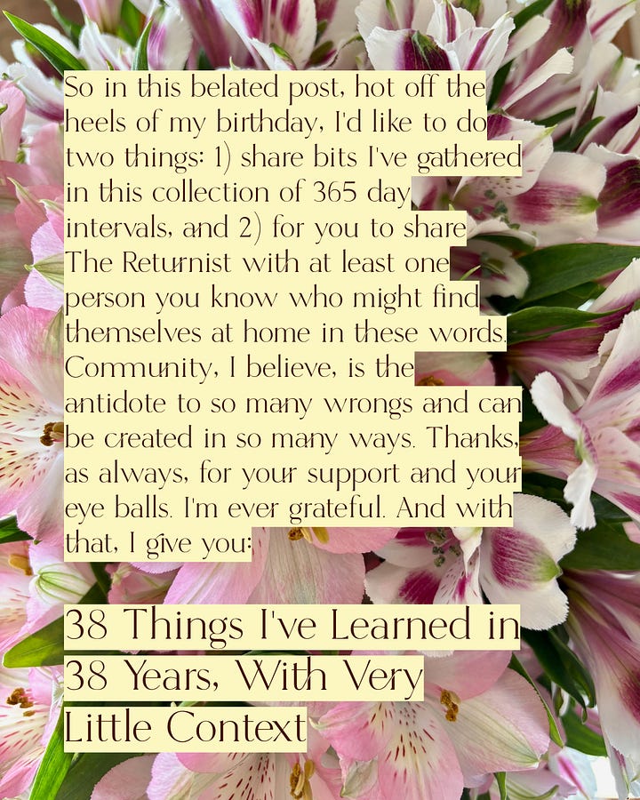 So in this belated post, hot off the heels of my birthday, I’d like to do two things: 1) share bits I’ve gathered in this collection of 365 day intervals, and 2) for you to share The Returnist with at least one person you know who might find themselves at home in these words. Community, I believe, is the antidote to so many wrongs and can be created in so many ways. Thanks, as always, for your support and your eye balls. I’m ever grateful. And with that, I give you: