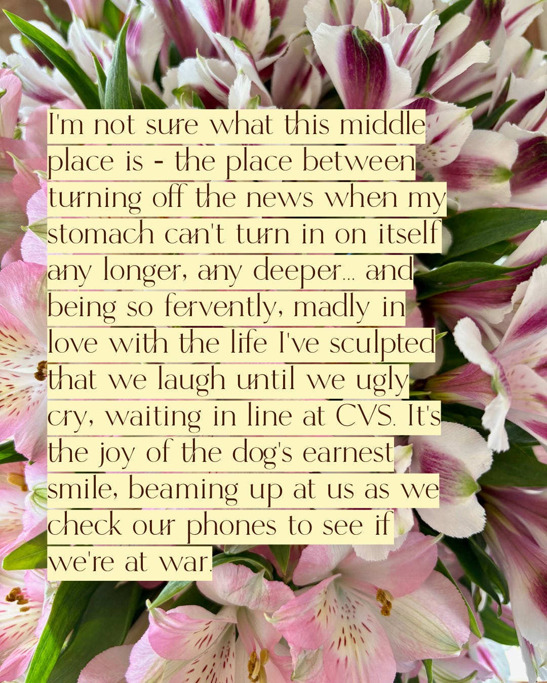 I have been struggling to get the requisite sleep, my skin feels dry, and this coffee isn’t working. It’s a beautiful sunshiney day in mid-January Los Angeles and there’s a new jazz record playing in the living room. Everything is right and also nothing is right. My loved ones are safe, secure, whole, moving forward. I made breakfast tacos for lunch and a cold pear snack revived me at 4pm. I’m not sure what this middle place is - the place between turning off the news when my stomach can’t turn in on itself any longer, any deeper… and being so fervently, madly in love with the life I’ve sculpted that we laugh until we ugly cry, waiting in line at CVS. It’s the joy of the dog’s earnest smile, beaming up at us as we check our phones to see if we’re at war.