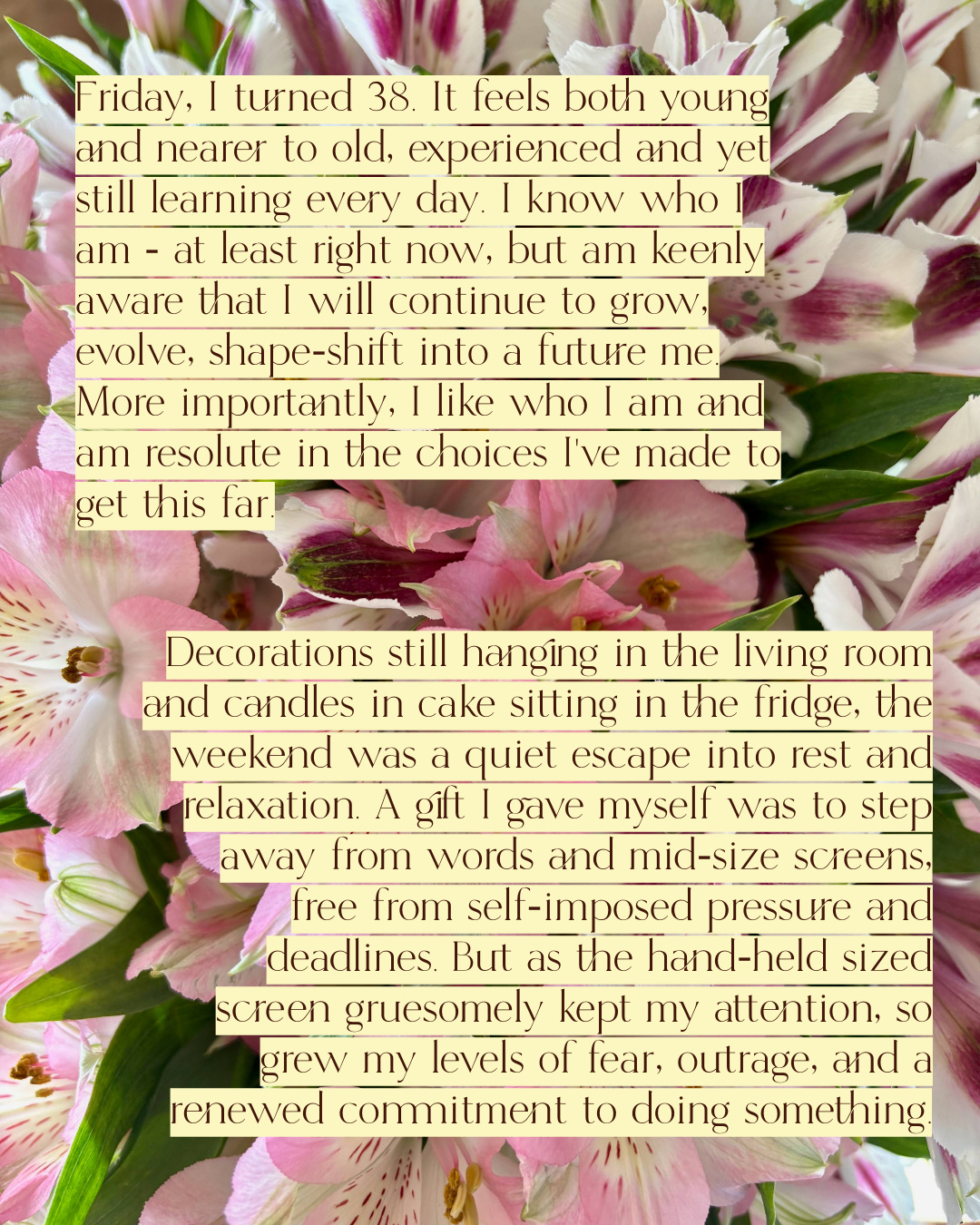 I’m very bad at asking for attention, particularly on my birthday. But this time around, I was surprised (big time!), seen, loved, made to feel as special as you can possibly imagine, and got to spend time with three of my favorite people on the planet who were cahoots-ing like wild to ensure the day was magic. Decorations still hanging in the living room and candles in cake sitting in the fridge, the weekend was a quiet escape into rest and relaxation. A gift I gave myself was to step away from words and mid-size screens, free from self-imposed pressure and deadlines. But as the hand-held sized screen gruesomely kept my attention, so grew my levels of fear, outrage, and a renewed commitment to doing something. It’s not exactly doom scrolling when you’re looking at facts, assessing damage, feeling deeply in your bones that we’re at an inflection point that’s scary to admit.