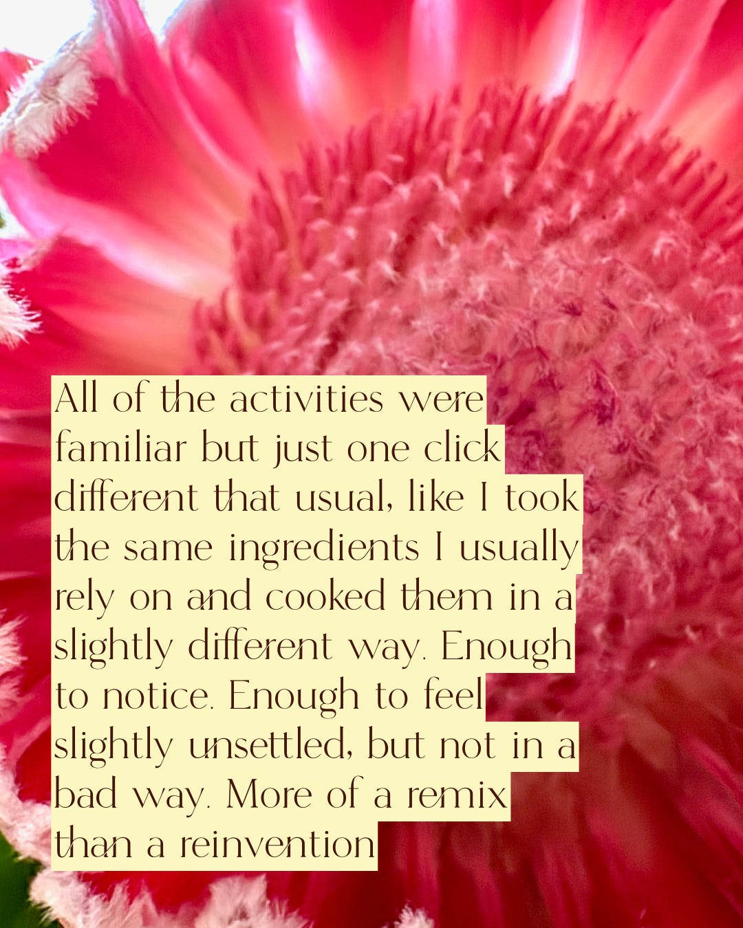 What “works” doesn’t have to be so rigid. There’s comfort in routines, and major love for my go-tos, but there’s also a quiet energy about trying new versions of old things and letting familiar patterns breathe a little. Keep the ingredients, change the proportions. Sometimes a remix is all it takes.