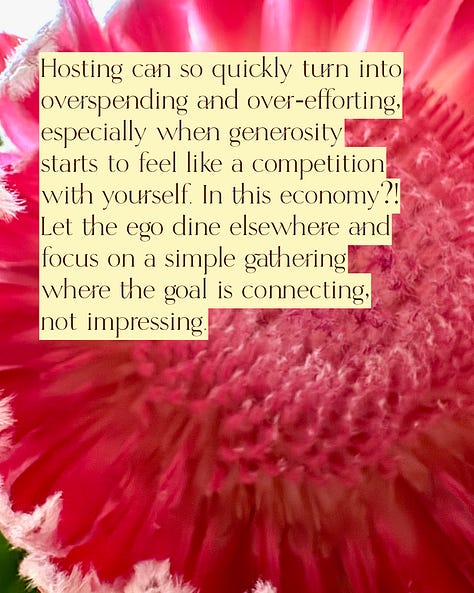 Host simply, and share the cost. Saturday night, Adam and I hosted our first little dinner party together. After a slightly rearranged start to our relationship, we’re entering into a beautiful new phase of doing things together with friends - things that feel normal but also new. Saturday we had a couple of friends over for a low-key soup and salad dinner. Yes there were some small bites to start and a dessert to finish, but I side-stepped the pretense of an elaborate menu. No quiet pressure to prove anything other than enjoying spending time together. Another bonus? We split the cost of the groceries, which made it refreshingly unglamorous in the best way. Hosting can so quickly turn into overspending and over-efforting, especially when generosity starts to feel like a competition with yourself. In this economy?! Let the ego dine elsewhere and focus on a simple gathering where the goal is connecting, not impressing. Let it cost less. Let it be enough.
