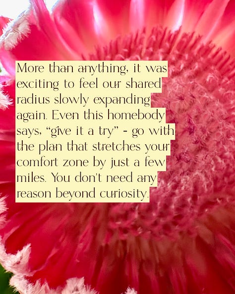 Say yes to the longer drive. Adam’s vinyl collecting is well-documented. He can happily spend hours (days? years?) digging through crates looking for the gems that someone less indoctrinated might pass up. He also has a fervent love of the San Gabriel Valley, so his nearly spontaneous plan to drive about an hour to a local radio station’s art and record show shouldn’t have been a surprise to me. Left to my own devices, I would’ve stayed close to home. Claremont is farther than I’d typically commit to without parking intel and a strong personal justification. Instead, we wandered booths, flipped through records, looked at art done by college students, and smiled as the bands playing in the background so earnestly put everything they had into the room. More than anything, it was exciting to feel our shared radius slowly expanding again. Even this homebody says, “give it a try” - go with the plan that stretches your comfort zone by just a few miles. You don’t need any reason beyond curiosity.