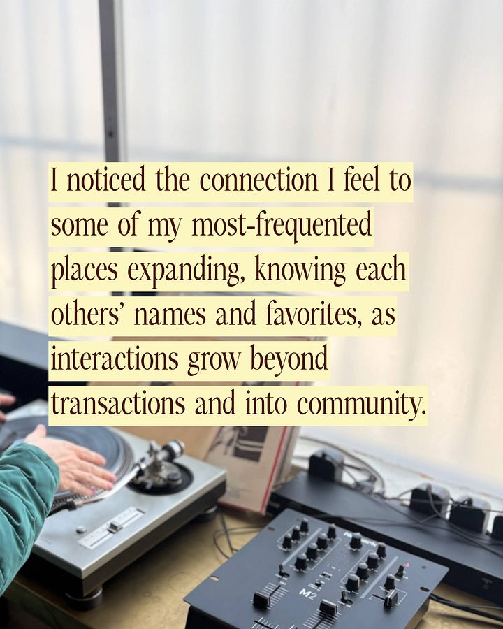 I noticed the connection I feel to some of my most-frequented places expanding, knowing each others’ names and favorites, as interactions grow beyond transactions and into community.