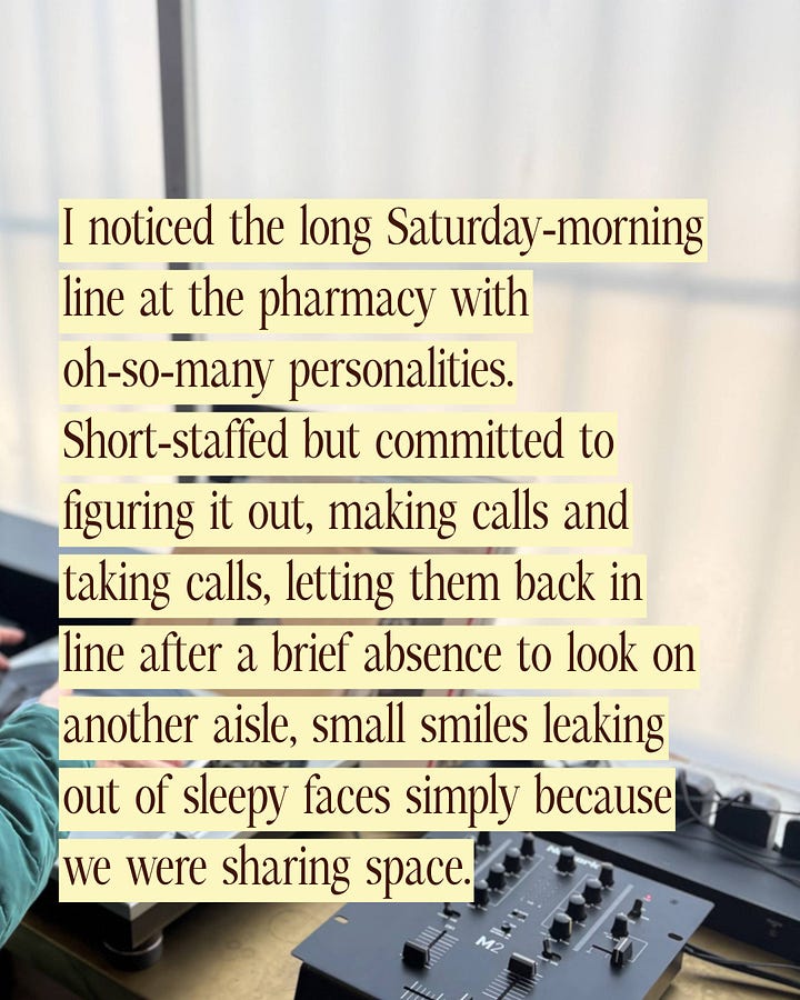 I noticed the long Saturday-morning line at the pharmacy with oh-so-many personalities. Short-staffed but committed to figuring it out, making calls and taking calls, letting them back in line after a brief absence to look on another aisle, small smiles leaking out of sleepy faces simply because we were sharing space.