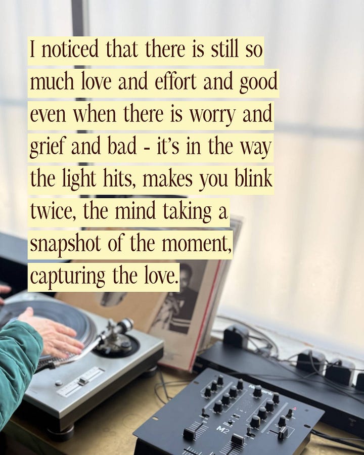 I noticed that there is still so much love and effort and good even when there is worry and grief and bad - it’s in the way the light hits, makes you blink twice, the mind taking a snapshot of the moment, capturing the love.