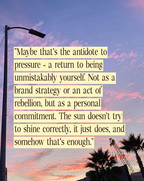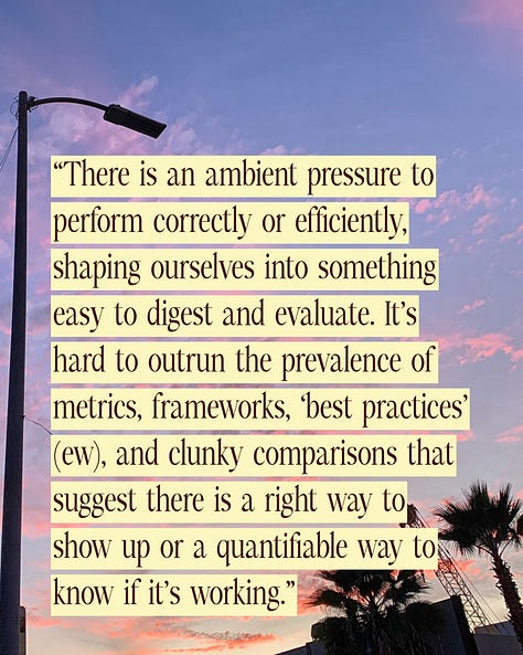 This week, I’ve been hyperaware of how loud the “how” narrative has become - how to look, succeed, grow, do, live, be. Not just for creators or founders or people trying to make something public, but for everyone. There is an ambient pressure to perform correctly or efficiently, shaping ourselves into something easy to digest and evaluate. It’s hard to outrun the prevalence of metrics, frameworks, “best practices” (ew), and clunky comparisons that suggest there is a right way to show up or a quantifiable way to know if it’s working.