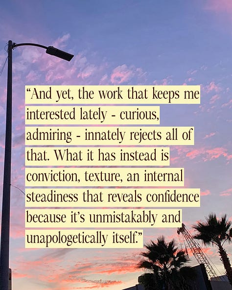 And yet, the work that keeps me interested lately - curious, admiring - innately rejects all of that. What it has instead is conviction, texture, an internal steadiness that reveals confidence because it’s unmistakably and unapologetically itself. If polish is present, it’s a bonus, not a goal. It’s raw and real and is so delightfully singular that it reminds you that yourself is something worthy.