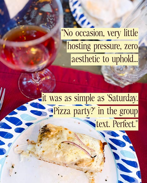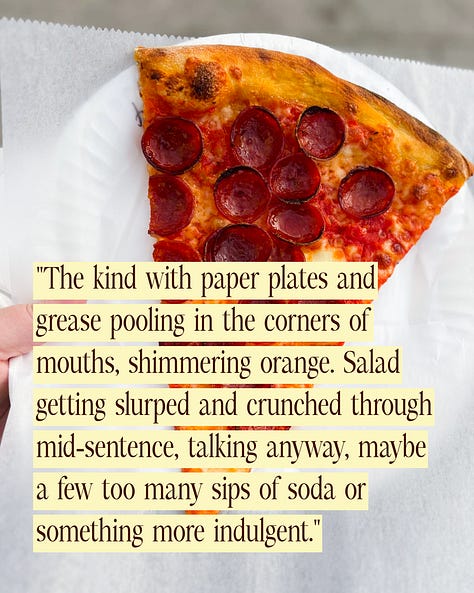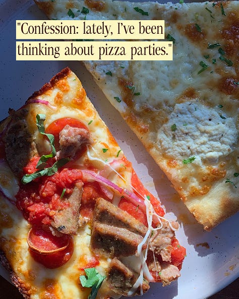 Confession: lately, I’ve been thinking about pizza parties. The kind with paper plates and grease pooling in the corners of mouths, shimmering orange. Salad getting slurped and crunched through mid-sentence, talking anyway, maybe a few too many sips of soda or something more indulgent. The kind of relaxed festivity that used to be built into youth - after a soccer game, for a classmate’s birthday, celebrating nothing and everything all at once.